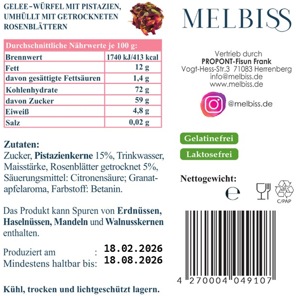 Dieses Lokum vereint die knackige Frische von Pistazien mit dem zarten Duft von Rosenblättern und entführt dich in eine Welt voller Genuss und Nostalgie.